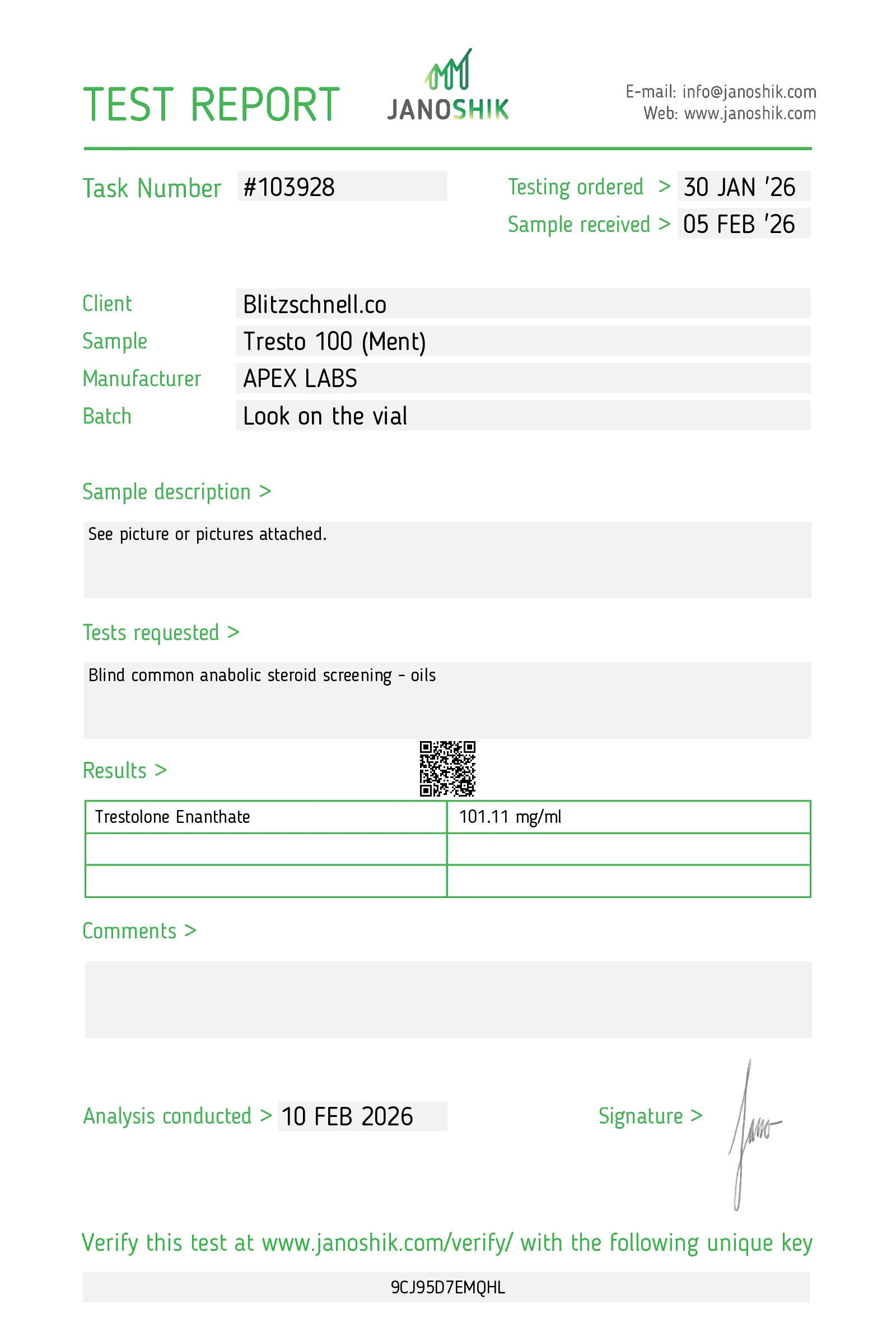 Sehr potentes und extrem anaboles 19-Nor-Androgen (Trestolon / MENT Enanthate) mit 100 mg/ml. Halbwertszeit ca. 7–10 Tage (ähnlich wie Testosteron Enanthate, oft ~8–9 Tage), Injektion typischerweise 1x wöchentlich oder alle 8–12 Tage (je nach Protokoll und individueller Clearance)